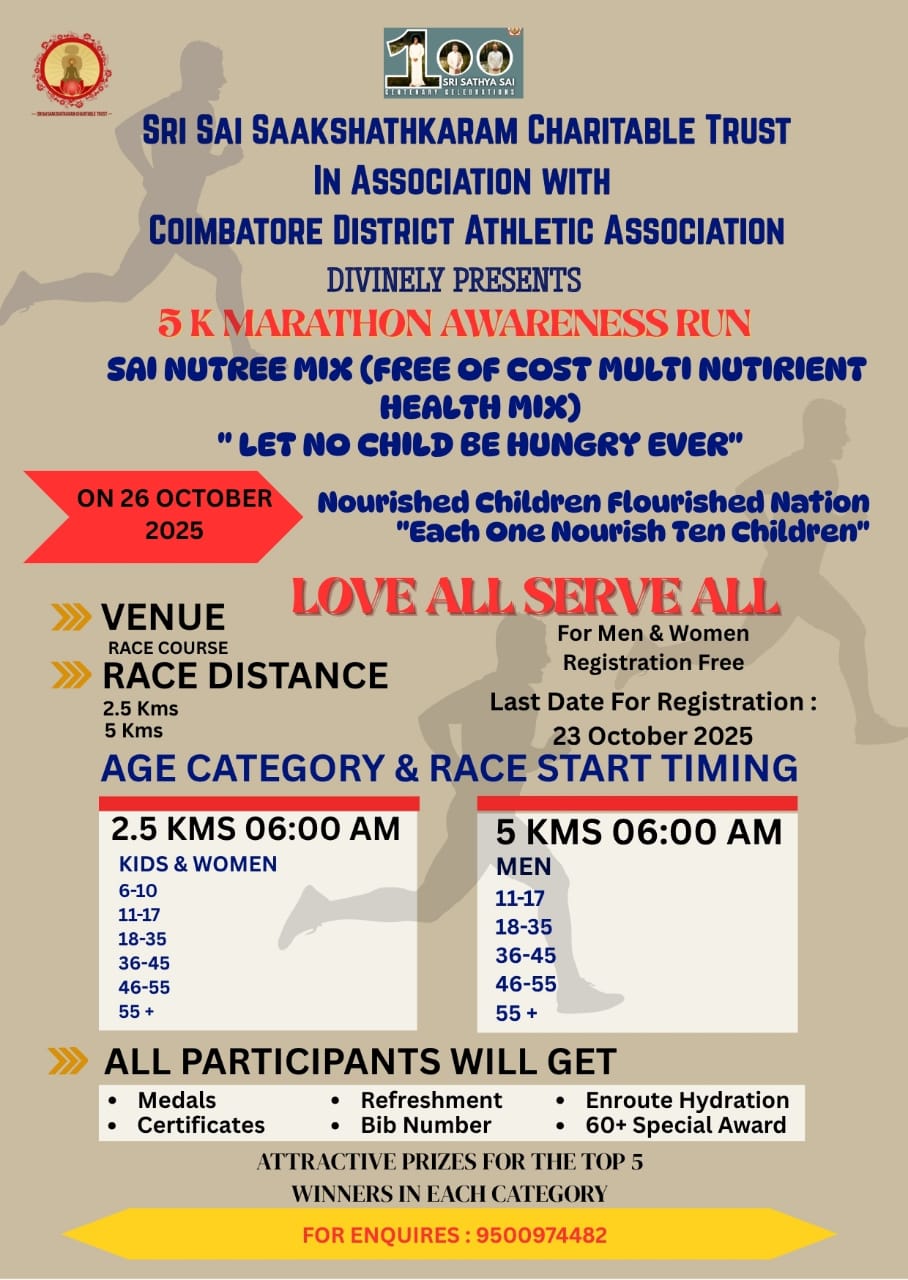 Scan the QR Code or Click above to contribute to Sai Nutree Mix distribution. ----------------------------------------------------------------------------------------------------------------------------------------------------------------- ----------------------------------------------------------------------------------------------------------------------------------------------------------------- LOVE ALL SERVE ALL SRI SAI SAAKSHATHKARAM CHARITABLE TRUST IN ASSOCIATION WITH COIMBATORE DISTRICT ATHLETIC ASSOCIATION DIVINELY PRESENTS 5 K MARATHON AWARENESS RUN 26 OCTOBER 2025 06:00 AM SAI NUTREE MIX (FREE OF COST MULTI NUTRIENT HEALTH MIX) "LET […]