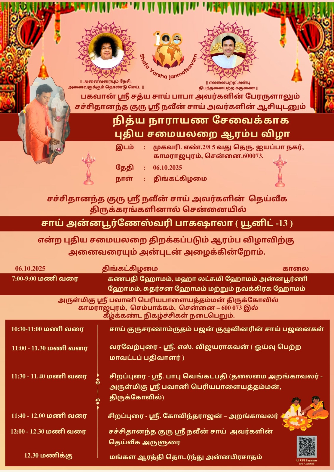 Sathya Sai Baba Varsha Janmotsavam || அனைவரையும் நேசி. அனைவருக்கும் தொண்டு செய். || பகவான் ஸ்ரீ சத்ய சாய் பாபா அவர்களின் போருளாயும் சச்சிதானந்த குரு ஸ்ரீ நவீன் சாய் அவர்களின் ஆசிபுடனும் நித்ய நாராயண சேவைக்காக புதிய சமையலறை ஆரம்ப விழா இடம் : முகவரி. எண்.2/8 5 வது தெரு, ஜெயபபா நகர், காமராஜபுரம், சென்னை.600073. தேதி : 06.10.2025 நாள் : திங்கட்கிழமை சச்சிதானந்த குரு ஸ்ரீ நவீன் சாய் […]